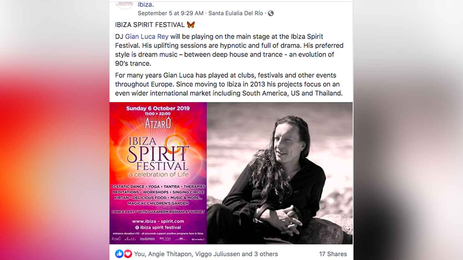 In 2019 he did played in the famous “IBIZA SPIRIT FESTIVAL” in Atzarò resort. His hypnotic set during the Opening Ceremony created the mood for an amazing event.